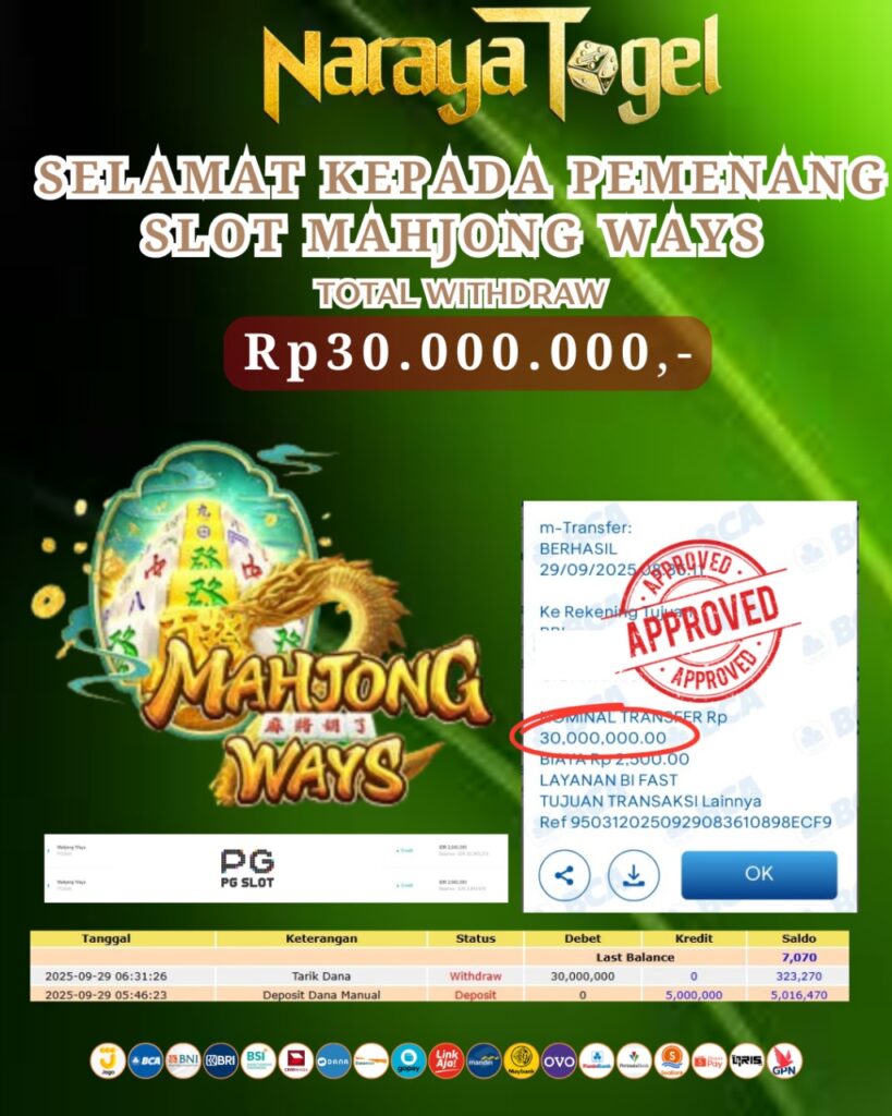 Selamat kepada User id TOP*****Telah berhasil mendapatkan kemenangan besar pada permainan  SLOT MAHJONG WAYS   Dengan kemenangan Sebesar  Rp 17.000.000 Setelah mengisi formulir withdraw dengan kurang waktu hanya 1 – 10 menit pihak NARAYATOGEL sudah melakukan transfer kepada pemiliknya dan dana sudah masuk ke rekening id tersebut oleh pemenang. Bukti pembayaran yang kami berikan merupakan bukti pembayaran yang SAH / VALID yang langsung di dapatkan melalui tanda transfer transaksi berhasil dari Bank yang di tuju.