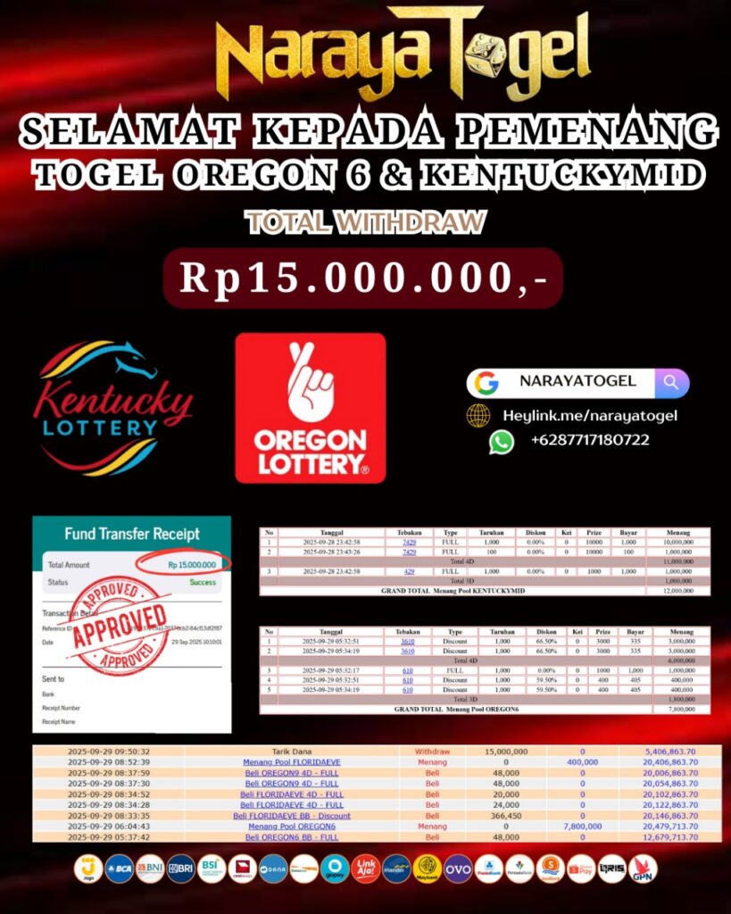 Selamat kepada User id TIO*****Telah berhasil mendapatkan kemenangan besar pada permainan  TOGEL OREGON 6 & KENTUCKYMID   Dengan kemenangan Sebesar  Rp 15.000.000 Setelah mengisi formulir withdraw dengan kurang waktu hanya 1 – 10 menit pihak NARAYATOGEL sudah melakukan transfer kepada pemiliknya dan dana sudah masuk ke rekening id tersebut oleh pemenang. Bukti pembayaran yang kami berikan merupakan bukti pembayaran yang SAH / VALID yang langsung di dapatkan melalui tanda transfer transaksi berhasil dari Bank yang di tuju.