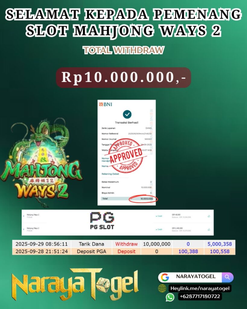 Selamat kepada User id GOP*****Telah berhasil mendapatkan kemenangan besar pada permainan  SLOT MAHJONG WAYS 2  Dengan kemenangan Sebesar  Rp 10.000.000 Setelah mengisi formulir withdraw dengan kurang waktu hanya 1 – 10 menit pihak NARAYATOGEL sudah melakukan transfer kepada pemiliknya dan dana sudah masuk ke rekening id tersebut oleh pemenang. Bukti pembayaran yang kami berikan merupakan bukti pembayaran yang SAH / VALID yang langsung di dapatkan melalui tanda transfer transaksi berhasil dari Bank yang di tuju.
