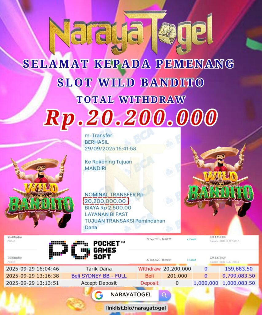 Selamat kepada User id NO*****Telah berhasil mendapatkan kemenangan besar pada permainan  SLOT WILD BANDITO  Dengan kemenangan Sebesar  Rp 20.200.000 Setelah mengisi formulir withdraw dengan kurang waktu hanya 1 – 10 menit pihak NARAYATOGEL sudah melakukan transfer kepada pemiliknya dan dana sudah masuk ke rekening id tersebut oleh pemenang. Bukti pembayaran yang kami berikan merupakan bukti pembayaran yang SAH / VALID yang langsung di dapatkan melalui tanda transfer transaksi berhasil dari Bank yang di tuju.