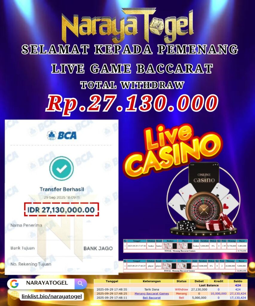 Selamat kepada User id USE*****Telah berhasil mendapatkan kemenangan besar pada permainan  LIVE GAME BACCARAT  Dengan kemenangan Sebesar  Rp 27.130.000 Setelah mengisi formulir withdraw dengan kurang waktu hanya 1 – 10 menit pihak NARAYATOGEL sudah melakukan transfer kepada pemiliknya dan dana sudah masuk ke rekening id tersebut oleh pemenang. Bukti pembayaran yang kami berikan merupakan bukti pembayaran yang SAH / VALID yang langsung di dapatkan melalui tanda transfer transaksi berhasil dari Bank yang di tuju.