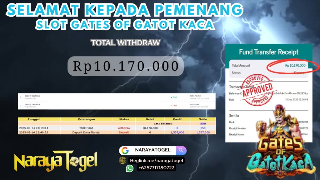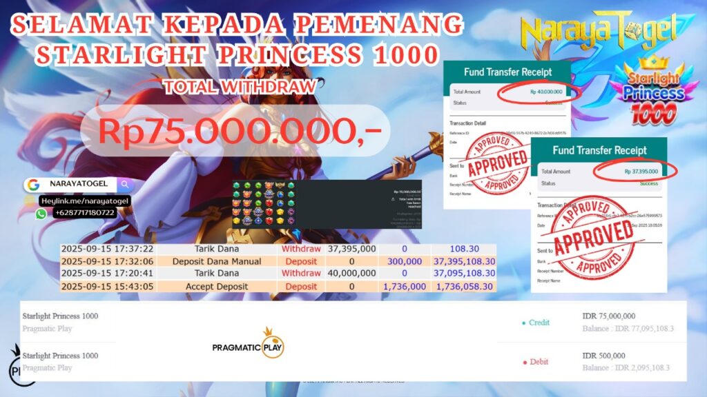 Selamat kepada User id FUI**Telah berhasil mendapatkan kemenangan besar pada permainan SLOT STARLIGHT PRINCESS 1000 Dengan kemenangan Sebesar Rp 75.000.000- Setelah mengisi formulir withdraw dengan kurang waktu hanya 1 – 10 menit pihak NARAYATOGEL sudah melakukan transfer kepada pemiliknya dan dana sudah masuk ke rekening id tersebut oleh pemenang. Bukti pembayaran yang kami berikan merupakan bukti pembayaran yang SAH / VALID yang langsung di dapatkan melalui tanda transfer transaksi berhasil dari Bank yang di tuju.