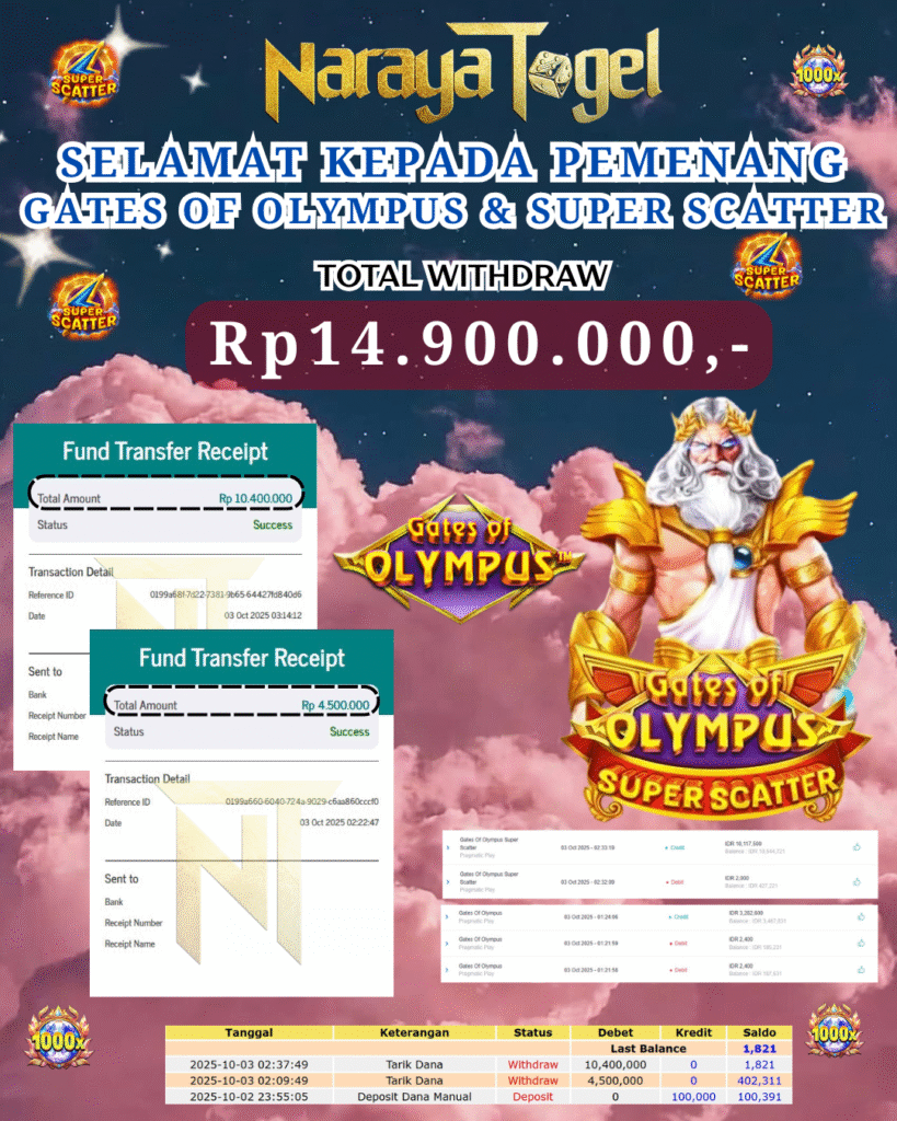 Selamat kepada User id WAN*****Telah berhasil mendapatkan kemenangan besar pada permainan SLOT GATES OF OLYMPUS SUPER SCATTER Dengan kemenangan Sebesar Rp 14.900.000 Setelah mengisi formulir withdraw dengan kurang waktu hanya 1 – 10 menit pihak NARAYATOGEL sudah melakukan transfer kepada pemiliknya dan dana sudah masuk ke rekening id tersebut oleh pemenang. Bukti pembayaran yang kami berikan merupakan bukti pembayaran yang SAH / VALID yang langsung di dapatkan melalui tanda transfer transaksi berhasil dari Bank yang di tuju.