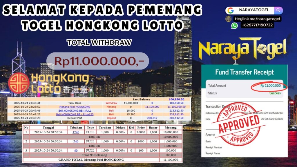 Selamat kepada User id KLP**** Telah berhasil mendapatkan kemenangan besar pada permainan HONGKONG LOTTO Dengan kemenangan Sebesar Rp11.000.000 Setelah mengisi formulir withdraw dengan kurang waktu hanya 1 – 10 menit pihak NARAYATOGEL sudah melakukan transfer kepada pemiliknya dan dana sudah masuk ke rekening id tersebut oleh pemenang. Bukti pembayaran yang kami berikan merupakan bukti pembayaran yang SAH / VALID yang langsung di dapatkan melalui tanda transfer transaksi berhasil dari Bank yang di tuju.