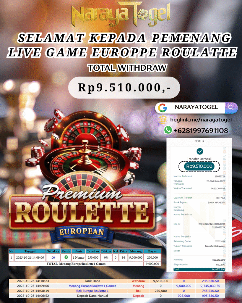 Selamat kepada User id ZIM**** Telah berhasil mendapatkan kemenangan besar pada permainan LIVE GAME EUROPPE ROULATTE Dengan kemenangan Sebesar Rp9.510.000 Setelah mengisi formulir withdraw dengan kurang waktu hanya 1 – 10 menit pihak NARAYATOGEL sudah melakukan transfer kepada pemiliknya dan dana sudah masuk ke rekening id tersebut oleh pemenang. Bukti pembayaran yang kami berikan merupakan bukti pembayaran yang SAH / VALID yang langsung di dapatkan melalui tanda transfer transaksi berhasil dari Bank yang di tuju.