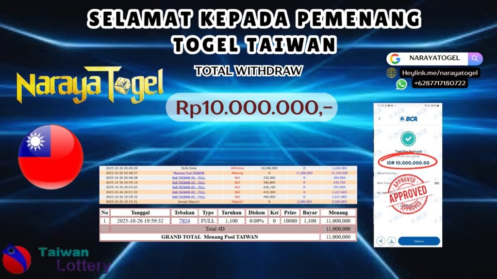 Selamat kepada User id JIO**** Telah berhasil mendapatkan kemenangan besar pada permainan TOGEL TAIWAN   Dengan kemenangan Sebesar  Rp 10.000.000 Setelah mengisi formulir withdraw dengan kurang waktu hanya 1 – 10 menit pihak NARAYATOGEL sudah melakukan transfer kepada pemiliknya dan dana sudah masuk ke rekening id tersebut oleh pemenang. Bukti pembayaran yang kami berikan merupakan bukti pembayaran yang SAH / VALID yang langsung di dapatkan melalui tanda transfer transaksi berhasil dari Bank yang di tuju.