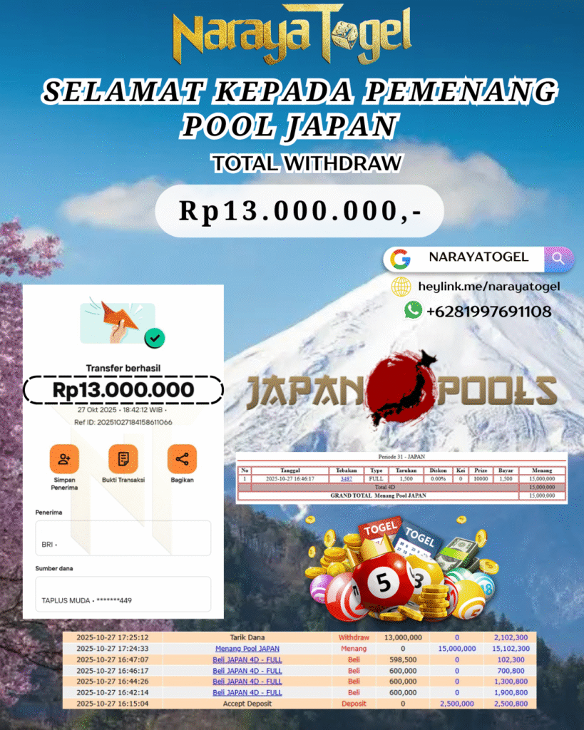 Selamat kepada User id SEY**** Telah berhasil mendapatkan kemenangan besar pada permainan JAPAN POOL Dengan kemenangan Sebesar Rp 13.000.000 Setelah mengisi formulir withdraw dengan kurang waktu hanya 1 – 10 menit pihak NARAYATOGEL sudah melakukan transfer kepada pemiliknya dan dana sudah masuk ke rekening id tersebut oleh pemenang. Bukti pembayaran yang kami berikan merupakan bukti pembayaran yang SAH / VALID yang langsung di dapatkan melalui tanda transfer transaksi berhasil dari Bank yang di tuju.