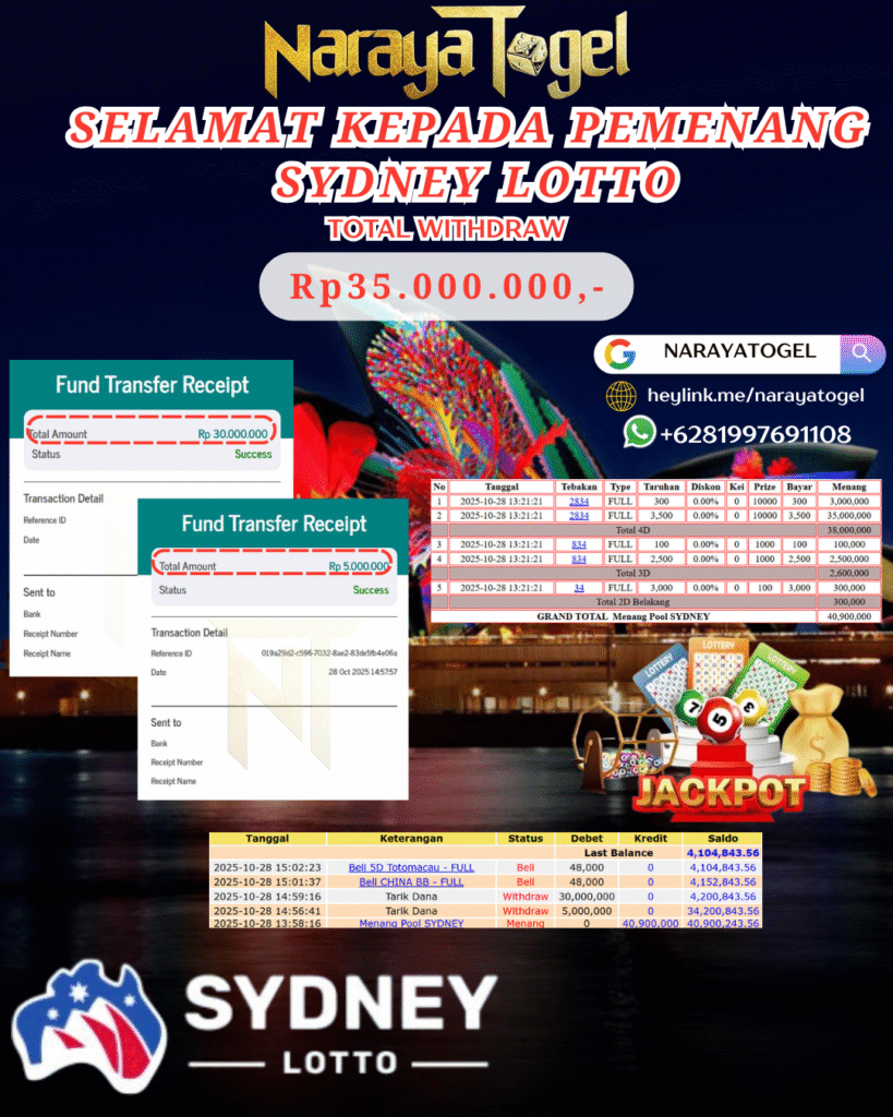 Selamat kepada User id YUD*** Telah berhasil mendapatkan kemenangan besar pada permainan SYDNEY LOTTO Dengan kemenangan Sebesar Rp 35.000.000 Setelah mengisi formulir withdraw dengan kurang waktu hanya 1 – 10 menit pihak NARAYATOGEL sudah melakukan transfer kepada pemiliknya dan dana sudah masuk ke rekening id tersebut oleh pemenang. Bukti pembayaran yang kami berikan merupakan bukti pembayaran yang SAH / VALID yang langsung di dapatkan melalui tanda transfer transaksi berhasil dari Bank yang di tuju.