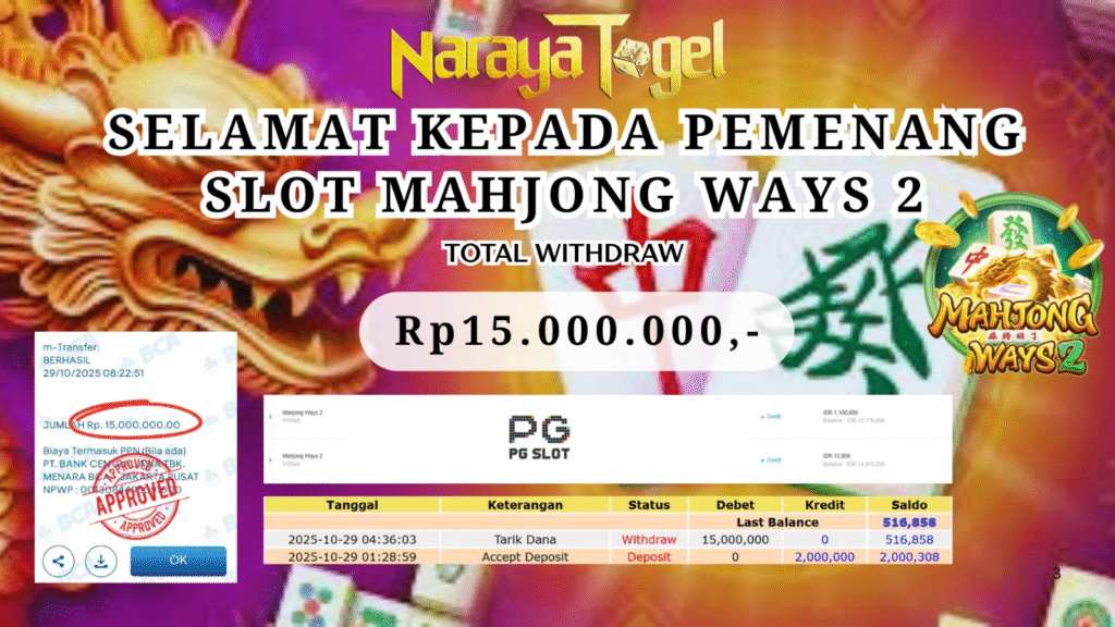 Selamat kepada User id FIU*** Telah berhasil mendapatkan kemenangan besar pada permainan SLOT MAHJONG WAYS 2 Dengan kemenangan Sebesar Rp 15.000.000 Setelah mengisi formulir withdraw dengan kurang waktu hanya 1 – 10 menit pihak NARAYATOGEL sudah melakukan transfer kepada pemiliknya dan dana sudah masuk ke rekening id tersebut oleh pemenang. Bukti pembayaran yang kami berikan merupakan bukti pembayaran yang SAH / VALID yang langsung di dapatkan melalui tanda transfer transaksi berhasil dari Bank yang di tuju.