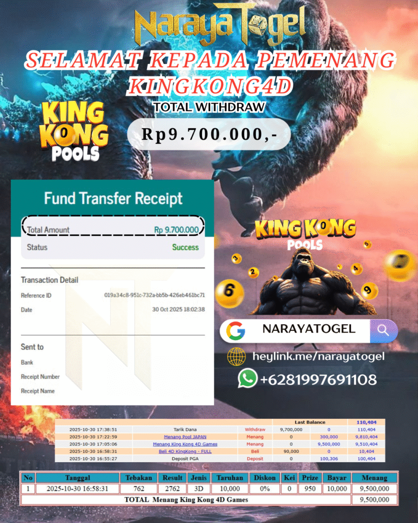 Selamat kepada User id SAK*** Telah berhasil mendapatkan kemenangan besar pada permainan   KINGKONG4D   Dengan kemenangan Sebesar  Rp 9.700.000 Setelah mengisi formulir withdraw dengan kurang waktu hanya 1 – 10 menit pihak NARAYATOGEL sudah melakukan transfer kepada pemiliknya dan dana sudah masuk ke rekening id tersebut oleh pemenang. Bukti pembayaran yang kami berikan merupakan bukti pembayaran yang SAH / VALID yang langsung di dapatkan melalui tanda transfer transaksi berhasil dari Bank yang di tuju.