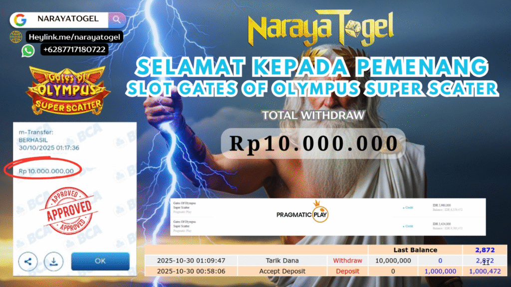 Selamat kepada User id DER*** Telah berhasil mendapatkan kemenangan besar pada permainan SLOT GATES OF OLYMPUS SUPER SCATER Dengan kemenangan Sebesar Rp 10.000.000 Setelah mengisi formulir withdraw dengan kurang waktu hanya 1 – 10 menit pihak NARAYATOGEL sudah melakukan transfer kepada pemiliknya dan dana sudah masuk ke rekening id tersebut oleh pemenang. Bukti pembayaran yang kami berikan merupakan bukti pembayaran yang SAH / VALID yang langsung di dapatkan melalui tanda transfer transaksi berhasil dari Bank yang di tuju.