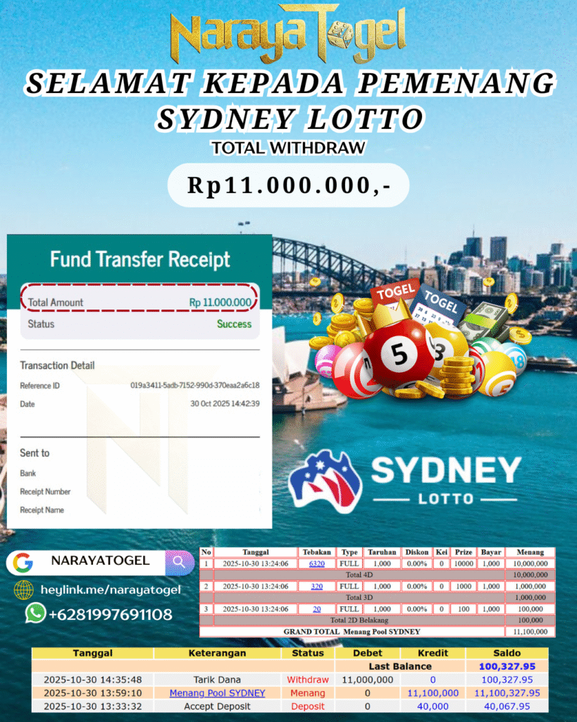 Selamat kepada User id SODA*** Telah berhasil mendapatkan kemenangan besar pada permainan SYDNEY LOTTO Dengan kemenangan Sebesar Rp 11.000.000 Setelah mengisi formulir withdraw dengan kurang waktu hanya 1 – 10 menit pihak NARAYATOGEL sudah melakukan transfer kepada pemiliknya dan dana sudah masuk ke rekening id tersebut oleh pemenang. Bukti pembayaran yang kami berikan merupakan bukti pembayaran yang SAH / VALID yang langsung di dapatkan melalui tanda transfer transaksi berhasil dari Bank yang di tuju.