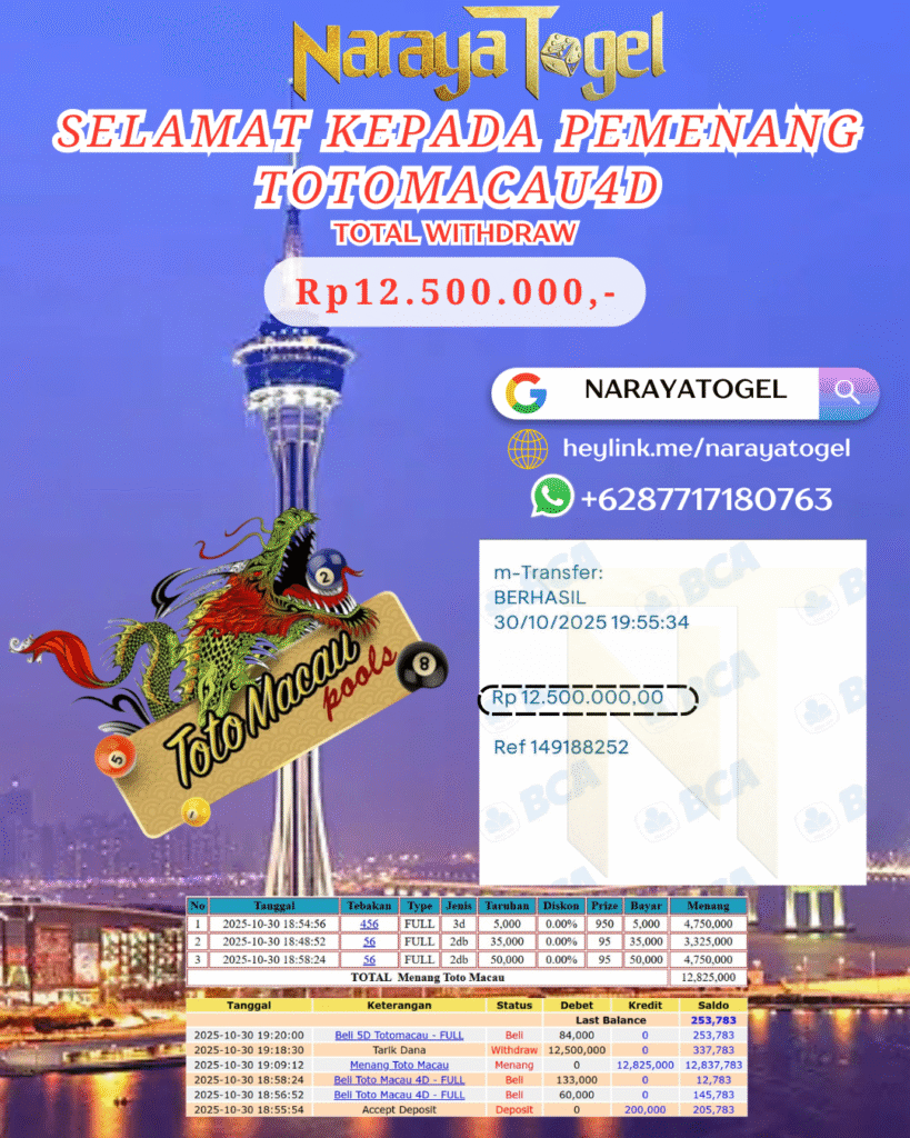 Masih ragu dengan NARAYA TOGEL bos ? Di mana bandar togel online sekarang yang terpercaya seperti NARAYATOGEL ? Bandar yang mengirimkan kemenangan member tanpa bertele – tele. Jadi…. tidak perlu khawatir pada situs NARAYATOGEL karena kemenangan anda berapapun akan dibayarakan hingga lunas kepada pemenang