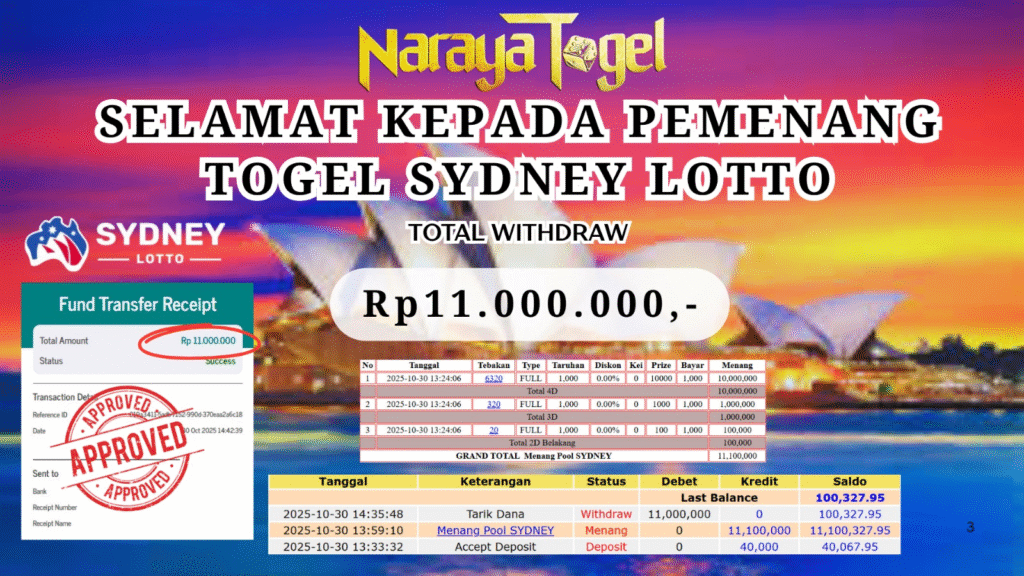 Selamat kepada User idGOP*** Telah berhasil mendapatkan kemenangan besar pada permainan   TOGEL SYDNEY LOTTO   Dengan kemenangan Sebesar  Rp 11.000.000 Setelah mengisi formulir withdraw dengan kurang waktu hanya 1 – 10 menit pihak NARAYATOGEL sudah melakukan transfer kepada pemiliknya dan dana sudah masuk ke rekening id tersebut oleh pemenang. Bukti pembayaran yang kami berikan merupakan bukti pembayaran yang SAH / VALID yang langsung di dapatkan melalui tanda transfer transaksi berhasil dari Bank yang di tuju.