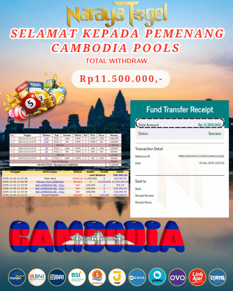selamat kepada User id ALZ*** Telah berhasil mendapatkan kemenangan besar pada permainan   CAMBODIA POOL   Dengan kemenangan Sebesar  Rp11.500.000 Setelah mengisi formulir withdraw dengan kurang waktu hanya 1 – 10 menit pihak NARAYATOGEL sudah melakukan transfer kepada pemiliknya dan dana sudah masuk ke rekening id tersebut oleh pemenang. Bukti pembayaran yang kami berikan merupakan bukti pembayaran yang SAH / VALID yang langsung di dapatkan melalui tanda transfer transaksi berhasil dari Bank yang di tuju.