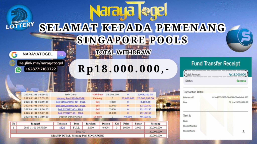 selamat kepada User id FAR*** Telah berhasil mendapatkan kemenangan besar pada permainan  SINGAPORE POOL   Dengan kemenangan Sebesar  Rp18.000.000 Setelah mengisi formulir withdraw dengan kurang waktu hanya 1 – 10 menit pihak NARAYATOGEL sudah melakukan transfer kepada pemiliknya dan dana sudah masuk ke rekening id tersebut oleh pemenang. Bukti pembayaran yang kami berikan merupakan bukti pembayaran yang SAH / VALID yang langsung di dapatkan melalui tanda transfer transaksi berhasil dari Bank yang di tuju.
