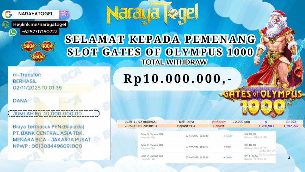 selamat kepada User id HOKI*** Telah berhasil mendapatkan kemenangan besar pada permainan   SLOT GATES OF OLYMPUS 1000   Dengan kemenangan Sebesar  Rp10.000.000 Setelah mengisi formulir withdraw dengan kurang waktu hanya 1 – 10 menit pihak NARAYATOGEL sudah melakukan transfer kepada pemiliknya dan dana sudah masuk ke rekening id tersebut oleh pemenang. Bukti pembayaran yang kami berikan merupakan bukti pembayaran yang SAH / VALID yang langsung di dapatkan melalui tanda transfer transaksi berhasil dari Bank yang di tuju.