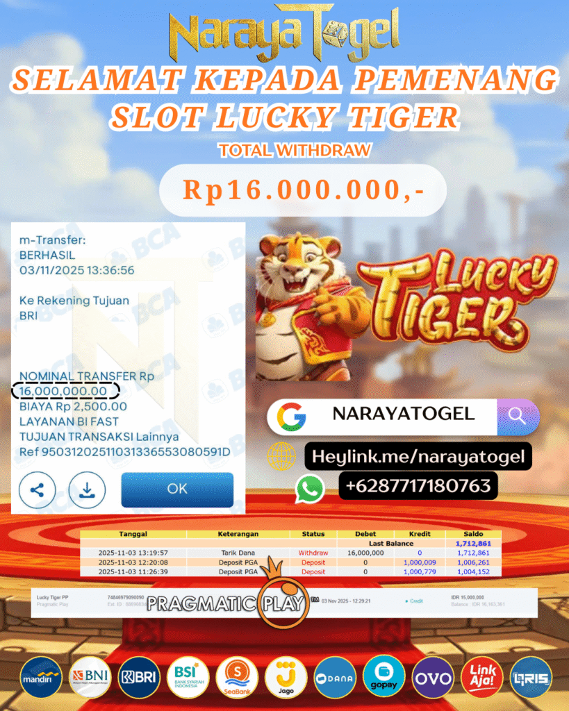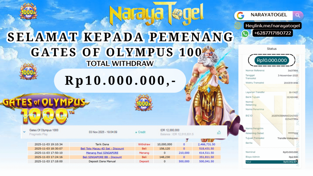 selamat kepada User id AYR*** Telah berhasil mendapatkan kemenangan besar pada permainan SLOT GATES OF OLYMPUS 1000 Dengan kemenangan Sebesar Rp10.000.000 Setelah mengisi formulir withdraw dengan kurang waktu hanya 1 – 10 menit pihak NARAYATOGEL sudah melakukan transfer kepada pemiliknya dan dana sudah masuk ke rekening id tersebut oleh pemenang. Bukti pembayaran yang kami berikan merupakan bukti pembayaran yang SAH / VALID yang langsung di dapatkan melalui tanda transfer transaksi berhasil dari Bank yang di tuju.