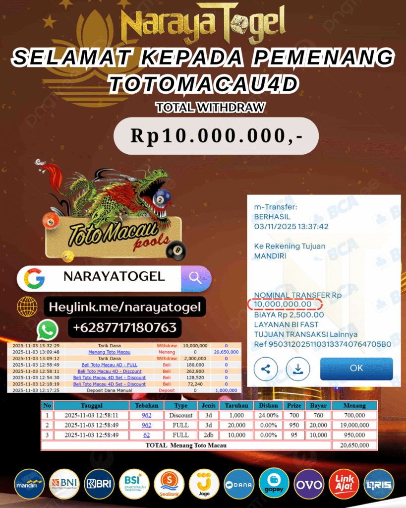 Masih ragu dengan NARAYA TOGEL bos ? Di mana bandar togel online sekarang yang terpercaya seperti NARAYATOGEL ? Bandar yang mengirimkan kemenangan member tanpa bertele – tele. Jadi…. tidak perlu khawatir pada situs NARAYATOGEL karena kemenangan anda berapapun akan dibayarakan hingga lunas kepada pemenang
