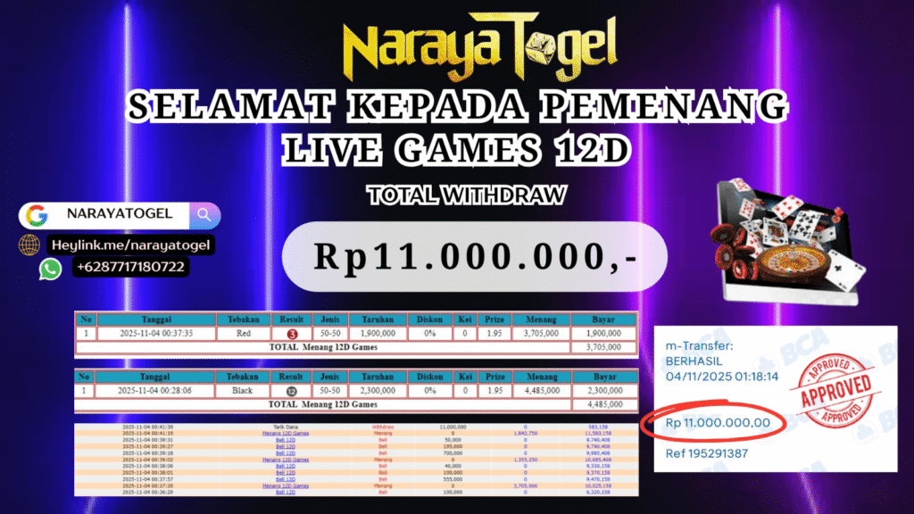 selamat kepada User id FER*** Telah berhasil mendapatkan kemenangan besar pada permainan LIVE GAMES 12D Dengan kemenangan Sebesar Rp11.000.000 Setelah mengisi formulir withdraw dengan kurang waktu hanya 1 – 10 menit pihak NARAYATOGEL sudah melakukan transfer kepada pemiliknya dan dana sudah masuk ke rekening id tersebut oleh pemenang. Bukti pembayaran yang kami berikan merupakan bukti pembayaran yang SAH / VALID yang langsung di dapatkan melalui tanda transfer transaksi berhasil dari Bank yang di tuju.