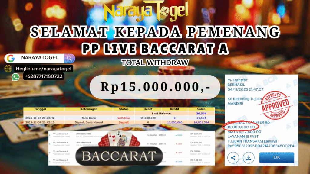 selamat kepada User id FUI*** Telah berhasil mendapatkan kemenangan besar pada permainan   PP LIVE BACCARAT A   Dengan kemenangan Sebesar  Rp15.000.000 Setelah mengisi formulir withdraw dengan kurang waktu hanya 1 – 10 menit pihak NARAYATOGEL sudah melakukan transfer kepada pemiliknya dan dana sudah masuk ke rekening id tersebut oleh pemenang. Bukti pembayaran yang kami berikan merupakan bukti pembayaran yang SAH / VALID yang langsung di dapatkan melalui tanda transfer transaksi berhasil dari Bank yang di tuju.