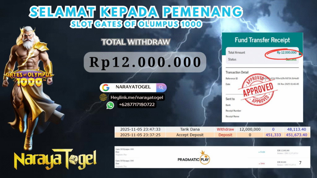 selamat kepada User id VER*** Telah berhasil mendapatkan kemenangan besar pada permainan SLOT GATES OF OLYMPUS 1000 Dengan kemenangan Sebesar Rp 12.000.000 Setelah mengisi formulir withdraw dengan kurang waktu hanya 1 – 10 menit pihak NARAYATOGEL sudah melakukan transfer kepada pemiliknya dan dana sudah masuk ke rekening id tersebut oleh pemenang. Bukti pembayaran yang kami berikan merupakan bukti pembayaran yang SAH / VALID yang langsung di dapatkan melalui tanda transfer transaksi berhasil dari Bank yang di tuju.