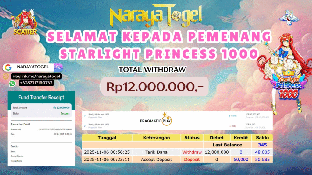 selamat kepada User id BIO*** Telah berhasil mendapatkan kemenangan besar pada permainan SLOT STARLIGHT PRINCESS 1000 Dengan kemenangan Sebesar Rp 12.000.000 Setelah mengisi formulir withdraw dengan kurang waktu hanya 1 – 10 menit pihak NARAYATOGEL sudah melakukan transfer kepada pemiliknya dan dana sudah masuk ke rekening id tersebut oleh pemenang. Bukti pembayaran yang kami berikan merupakan bukti pembayaran yang SAH / VALID yang langsung di dapatkan melalui tanda transfer transaksi berhasil dari Bank yang di tuju.