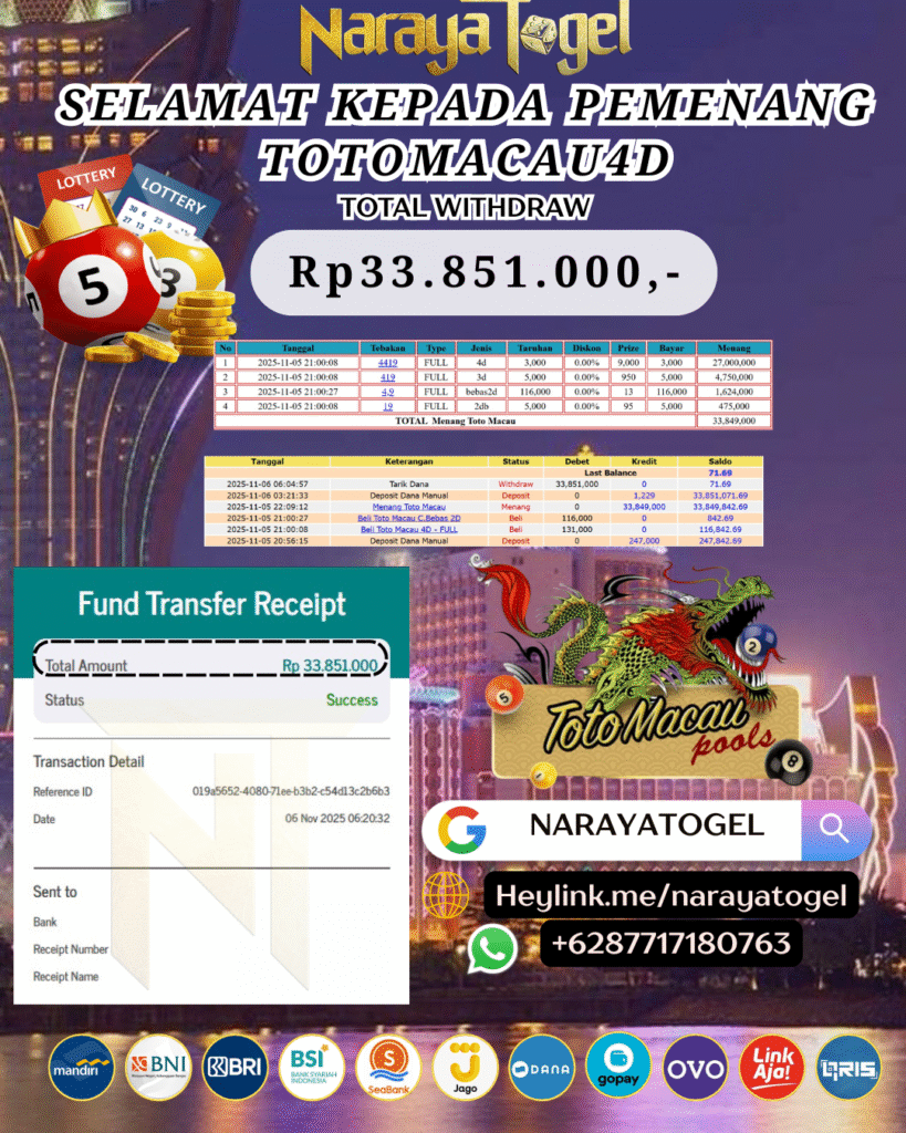 selamat kepada User id TOK*** Telah berhasil mendapatkan kemenangan besar pada permainan TOTOMACAU4D Dengan kemenangan Sebesar Rp 33.851.000 Setelah mengisi formulir withdraw dengan kurang waktu hanya 1 – 10 menit pihak NARAYATOGEL sudah melakukan transfer kepada pemiliknya dan dana sudah masuk ke rekening id tersebut oleh pemenang. Bukti pembayaran yang kami berikan merupakan bukti pembayaran yang SAH / VALID yang langsung di dapatkan melalui tanda transfer transaksi berhasil dari Bank yang di tuju.