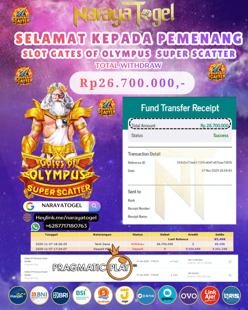 selamat kepada User id JAJA*** Telah berhasil mendapatkan kemenangan besar pada permainan   GATES OF OLYMPUS SUPER SCATTER   Dengan kemenangan Sebesar  Rp 26.700.000 Setelah mengisi formulir withdraw dengan kurang waktu hanya 1 – 10 menit pihak NARAYATOGEL sudah melakukan transfer kepada pemiliknya dan dana sudah masuk ke rekening id tersebut oleh pemenang. Bukti pembayaran yang kami berikan merupakan bukti pembayaran yang SAH / VALID yang langsung di dapatkan melalui tanda transfer transaksi berhasil dari Bank yang di tuju.