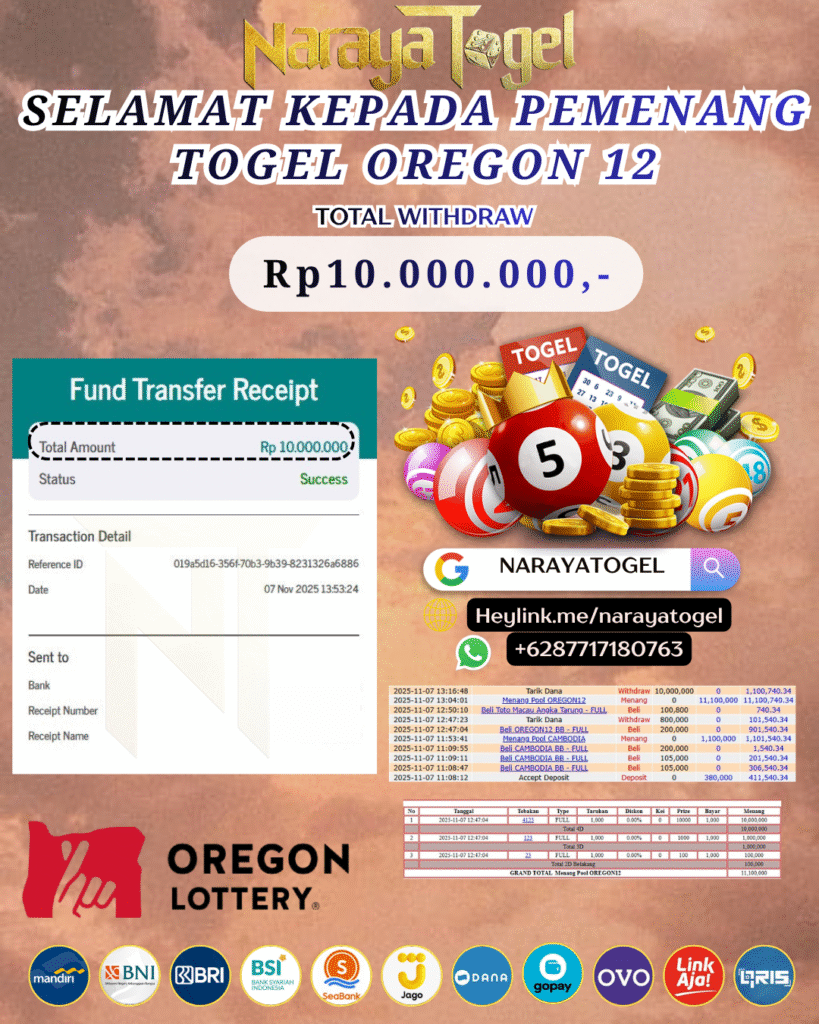 selamat kepada User id BEG*** Telah berhasil mendapatkan kemenangan besar pada permainan   TOGEL OREGON 12   Dengan kemenangan Sebesar  Rp 10.000.000 Setelah mengisi formulir withdraw dengan kurang waktu hanya 1 – 10 menit pihak NARAYATOGEL sudah melakukan transfer kepada pemiliknya dan dana sudah masuk ke rekening id tersebut oleh pemenang. Bukti pembayaran yang kami berikan merupakan bukti pembayaran yang SAH / VALID yang langsung di dapatkan melalui tanda transfer transaksi berhasil dari Bank yang di tuju.