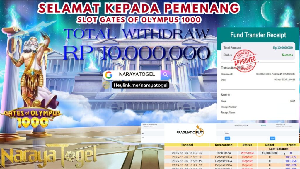 selamat kepada User id BLE*** Telah berhasil mendapatkan kemenangan besar pada permainan SLOT GATES OF OLYMPUS 1000 Dengan kemenangan Sebesar Rp 10.00.000 Setelah mengisi formulir withdraw dengan kurang waktu hanya 1 – 10 menit pihak NARAYATOGEL sudah melakukan transfer kepada pemiliknya dan dana sudah masuk ke rekening id tersebut oleh pemenang. Bukti pembayaran yang kami berikan merupakan bukti pembayaran yang SAH / VALID yang langsung di dapatkan melalui tanda transfer transaksi berhasil dari Bank yang di tuju.