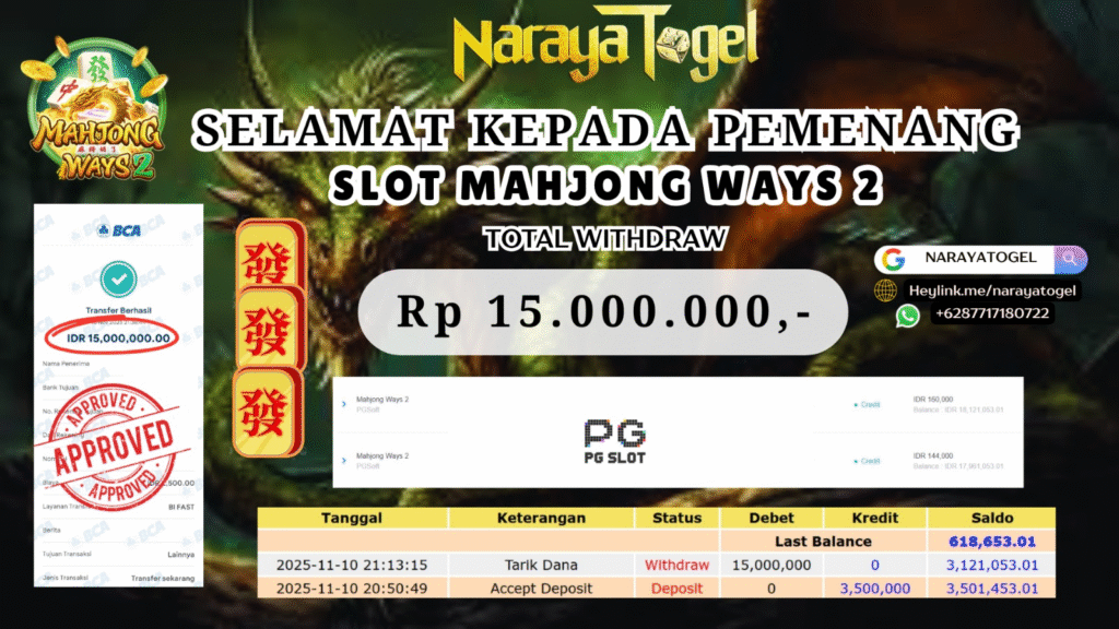 selamat kepada User id DER* Telah berhasil mendapatkan kemenangan besar pada permainan SLOT MAHJONG WAYS 2 Dengan kemenangan Sebesar Rp 15.000.000 Setelah mengisi formulir withdraw dengan kurang waktu hanya 1 – 10 menit pihak NARAYATOGEL sudah melakukan transfer kepada pemiliknya dan dana sudah masuk ke rekening id tersebut oleh pemenang. Bukti pembayaran yang kami berikan merupakan bukti pembayaran yang SAH / VALID yang langsung di dapatkan melalui tanda transfer transaksi berhasil dari Bank yang di tuju.
