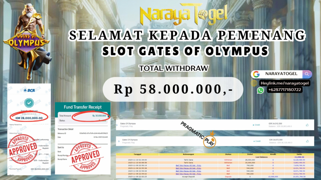 selamat kepada User id vop*** Telah berhasil mendapatkan kemenangan besar pada permainan SLOT GATES OF OLYMPUS Dengan kemenangan Sebesar Rp 58.000.000 Setelah mengisi formulir withdraw dengan kurang waktu hanya 1 – 10 menit pihak NARAYATOGEL sudah melakukan transfer kepada pemiliknya dan dana sudah masuk ke rekening id tersebut oleh pemenang. Bukti pembayaran yang kami berikan merupakan bukti pembayaran yang SAH / VALID yang langsung di dapatkan melalui tanda transfer transaksi berhasil dari Bank yang di tuju.