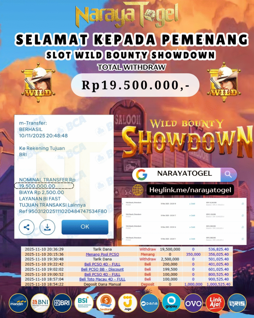 selamat kepada User id FER** Telah berhasil mendapatkan kemenangan besar pada permainan SLOT WILD BOUNTY SHOWDOWN Dengan kemenangan Sebesar Rp 19.000.000 Setelah mengisi formulir withdraw dengan kurang waktu hanya 1 – 10 menit pihak NARAYATOGEL sudah melakukan transfer kepada pemiliknya dan dana sudah masuk ke rekening id tersebut oleh pemenang. Bukti pembayaran yang kami berikan merupakan bukti pembayaran yang SAH / VALID yang langsung di dapatkan melalui tanda transfer transaksi berhasil dari Bank yang di tuju.