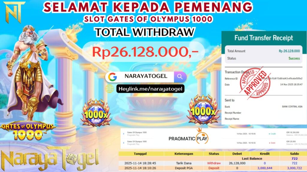 Selamat kepada User id JAM*** Telah berhasil mendapatkan kemenangan besar pada permainan SLOT GATES OF OLYMPUS 1000 Dengan kemenangan Sebesar Rp 15.000.000 Setelah mengisi formulir withdraw dengan kurang waktu hanya 1 – 10 menit pihak NARAYATOGEL sudah melakukan transfer kepada pemiliknya dan dana sudah masuk ke rekening id tersebut oleh pemenang. Bukti pembayaran yang kami berikan merupakan bukti pembayaran yang SAH / VALID yang langsung di dapatkan melalui tanda transfer transaksi berhasil dari Bank yang di tuju.