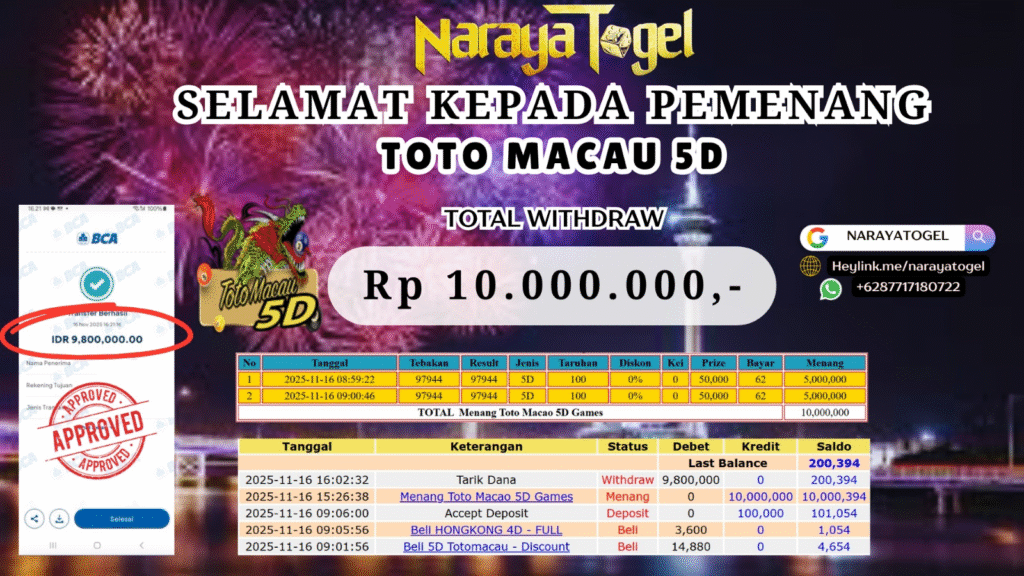 selamat kepada User id FER* Telah berhasil mendapatkan kemenangan besar pada permainan TOTO MACAU 5D Dengan kemenangan Sebesar Rp 10.000.000 Setelah mengisi formulir withdraw dengan kurang waktu hanya 1 – 10 menit pihak NARAYATOGEL sudah melakukan transfer kepada pemiliknya dan dana sudah masuk ke rekening id tersebut oleh pemenang. Bukti pembayaran yang kami berikan merupakan bukti pembayaran yang SAH / VALID yang langsung di dapatkan melalui tanda transfer transaksi berhasil dari Bank yang di tuju.