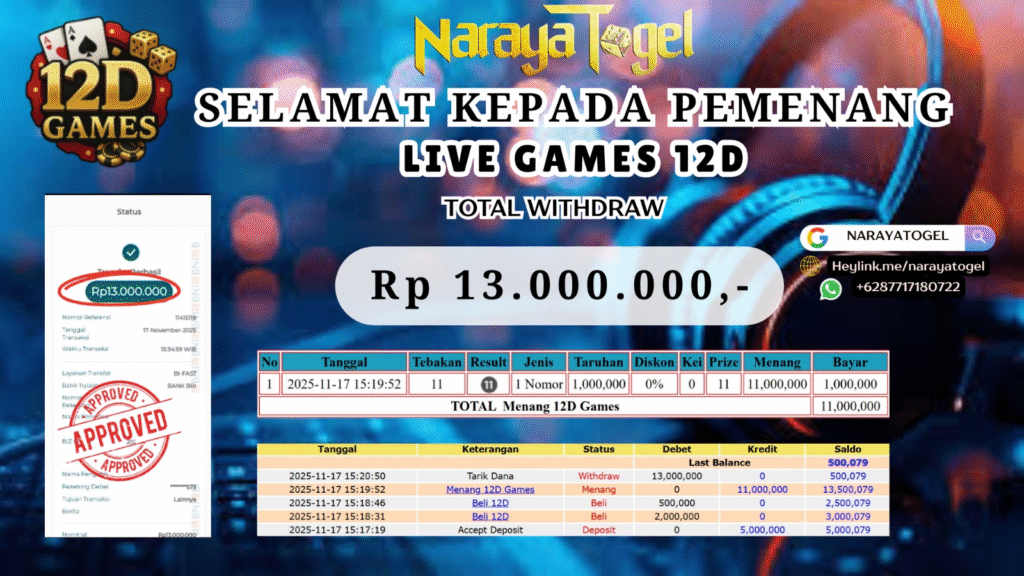 selamat kepada User id VOP* Telah berhasil mendapatkan kemenangan besar pada permainan LIVE GAMES 12D Dengan kemenangan Sebesar Rp 13.000.000 Setelah mengisi formulir withdraw dengan kurang waktu hanya 1 – 10 menit pihak NARAYATOGEL sudah melakukan transfer kepada pemiliknya dan dana sudah masuk ke rekening id tersebut oleh pemenang. Bukti pembayaran yang kami berikan merupakan bukti pembayaran yang SAH / VALID yang langsung di dapatkan melalui tanda transfer transaksi berhasil dari Bank yang di tuju.
