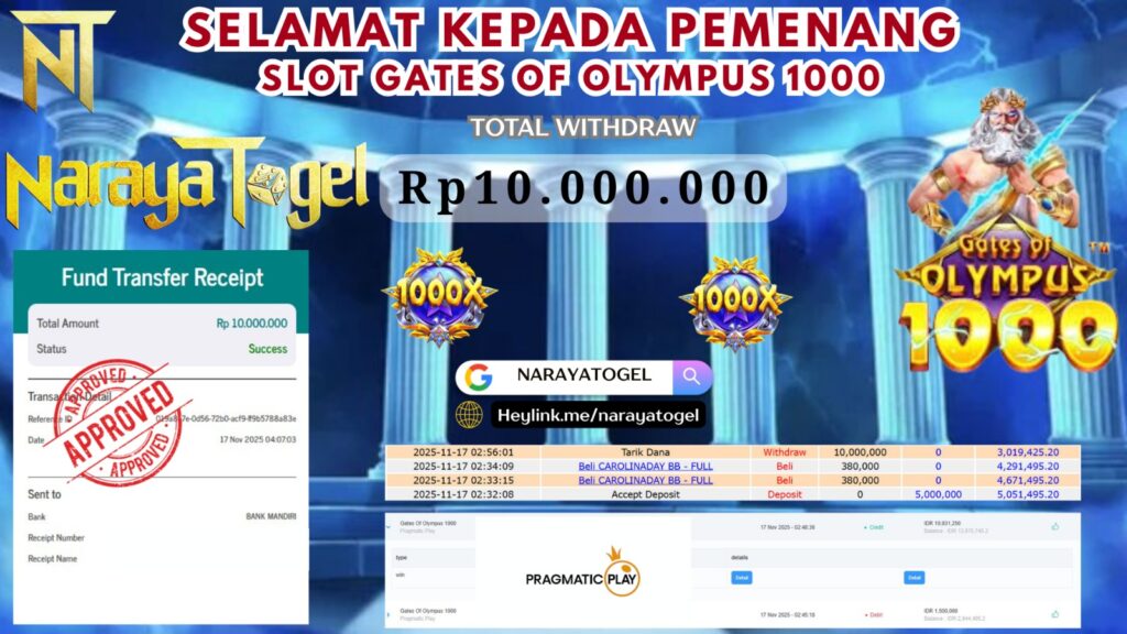 selamat kepada User id ALI* Telah berhasil mendapatkan kemenangan besar pada permainan SLOT GATES OF OLYMPUS 1000 Dengan kemenangan Sebesar Rp 10.000.000 Setelah mengisi formulir withdraw dengan kurang waktu hanya 1 – 10 menit pihak NARAYATOGEL sudah melakukan transfer kepada pemiliknya dan dana sudah masuk ke rekening id tersebut oleh pemenang. Bukti pembayaran yang kami berikan merupakan bukti pembayaran yang SAH / VALID yang langsung di dapatkan melalui tanda transfer transaksi berhasil dari Bank yang di tuju.
