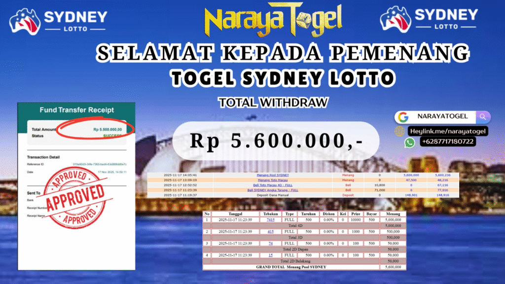 selamat kepada User id UIO* Telah berhasil mendapatkan kemenangan besar pada permainan TOGEL SYDNEY LOTTO Dengan kemenangan Sebesar Rp 5.600.000 Setelah mengisi formulir withdraw dengan kurang waktu hanya 1 – 10 menit pihak NARAYATOGEL sudah melakukan transfer kepada pemiliknya dan dana sudah masuk ke rekening id tersebut oleh pemenang. Bukti pembayaran yang kami berikan merupakan bukti pembayaran yang SAH / VALID yang langsung di dapatkan melalui tanda transfer transaksi berhasil dari Bank yang di tuju.