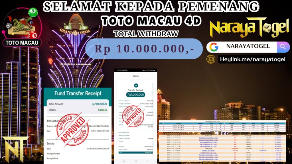 selamat kepada User id MAX* Telah berhasil mendapatkan kemenangan besar pada permainan TOTOMACAU 4D Dengan kemenangan Sebesar Rp10.000.000 Setelah mengisi formulir withdraw dengan kurang waktu hanya 1 – 10 menit pihak NARAYATOGEL sudah melakukan transfer kepada pemiliknya dan dana sudah masuk ke rekening id tersebut oleh pemenang. Bukti pembayaran yang kami berikan merupakan bukti pembayaran yang SAH / VALID yang langsung di dapatkan melalui tanda transfer transaksi berhasil dari Bank yang di tuju.