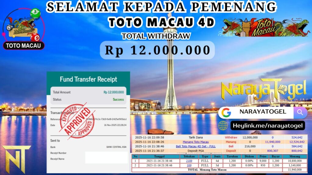 selamat kepada User id JACK* Telah berhasil mendapatkan kemenangan besar pada permainan TOTOMACAU 4D Dengan kemenangan Sebesar Rp 12.000.000 Setelah mengisi formulir withdraw dengan kurang waktu hanya 1 – 10 menit pihak NARAYATOGEL sudah melakukan transfer kepada pemiliknya dan dana sudah masuk ke rekening id tersebut oleh pemenang. Bukti pembayaran yang kami berikan merupakan bukti pembayaran yang SAH / VALID yang langsung di dapatkan melalui tanda transfer transaksi berhasil dari Bank yang di tuju.