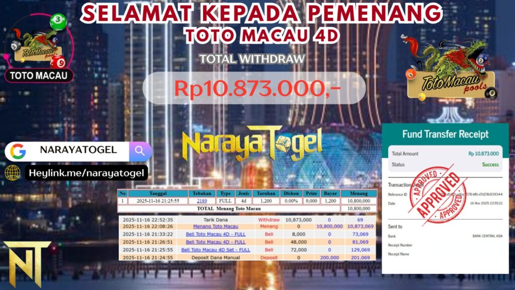 selamat kepada User id KALIS* Telah berhasil mendapatkan kemenangan besar pada permainan TOTOMACAU4D Dengan kemenangan Sebesar Rp 10.873.000 Setelah mengisi formulir withdraw dengan kurang waktu hanya 1 – 10 menit pihak NARAYATOGEL sudah melakukan transfer kepada pemiliknya dan dana sudah masuk ke rekening id tersebut oleh pemenang. Bukti pembayaran yang kami berikan merupakan bukti pembayaran yang SAH / VALID yang langsung di dapatkan melalui tanda transfer transaksi berhasil dari Bank yang di tuju.