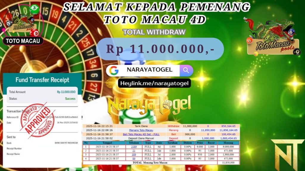 selamat kepada User id NAH* Telah berhasil mendapatkan kemenangan besar pada permainan TOTOMACAU4D Dengan kemenangan Sebesar Rp 11.000.000 Setelah mengisi formulir withdraw dengan kurang waktu hanya 1 – 10 menit pihak NARAYATOGEL sudah melakukan transfer kepada pemiliknya dan dana sudah masuk ke rekening id tersebut oleh pemenang. Bukti pembayaran yang kami berikan merupakan bukti pembayaran yang SAH / VALID yang langsung di dapatkan melalui tanda transfer transaksi berhasil dari Bank yang di tuju.