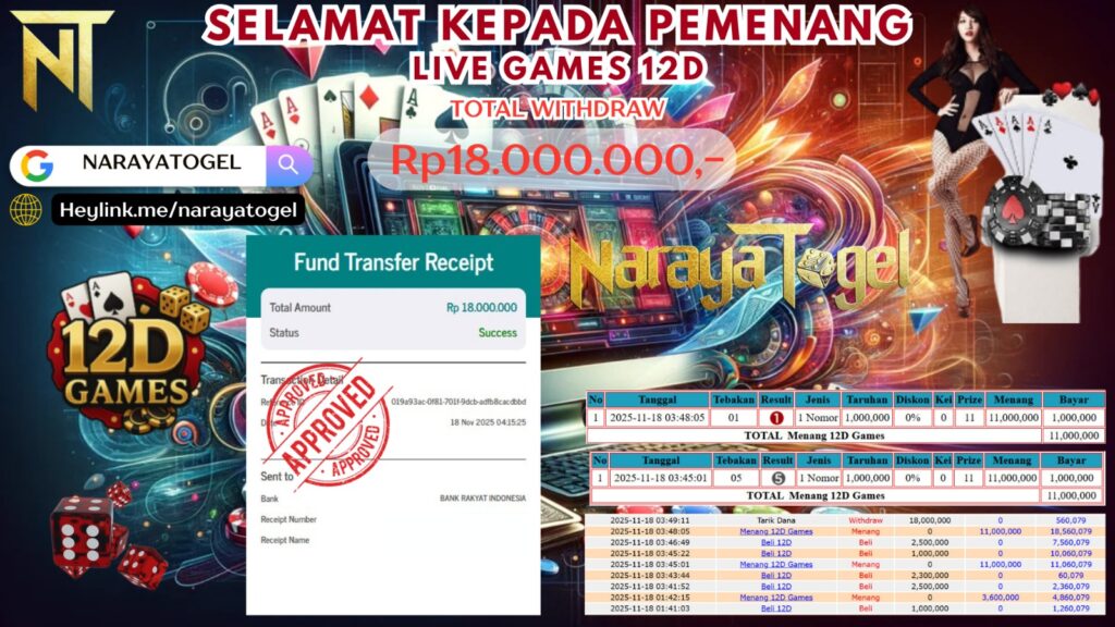 selamat kepada User id GIB* Telah berhasil mendapatkan kemenangan besar pada permainan LIVE GAMES 12D Dengan kemenangan Sebesar Rp 18.000.000 Setelah mengisi formulir withdraw dengan kurang waktu hanya 1 – 10 menit pihak NARAYATOGEL sudah melakukan transfer kepada pemiliknya dan dana sudah masuk ke rekening id tersebut oleh pemenang. Bukti pembayaran yang kami berikan merupakan bukti pembayaran yang SAH / VALID yang langsung di dapatkan melalui tanda transfer transaksi berhasil dari Bank yang di tuju.