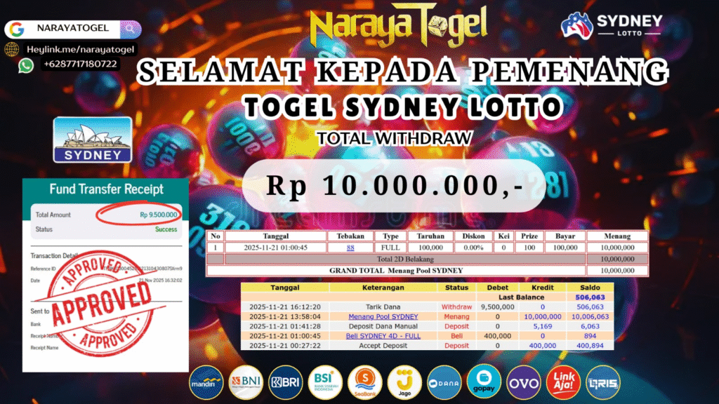 selamat kepada User id BUI* Telah berhasil mendapatkan kemenangan besar pada permainan TOGEL SYDNEY LOTTO Dengan kemenangan Sebesar Rp 10.000.000 Setelah mengisi formulir withdraw dengan kurang waktu hanya 1 – 10 menit pihak NARAYATOGEL sudah melakukan transfer kepada pemiliknya dan dana sudah masuk ke rekening id tersebut oleh pemenang. Bukti pembayaran yang kami berikan merupakan bukti pembayaran yang SAH / VALID yang langsung di dapatkan melalui tanda transfer transaksi berhasil dari Bank yang di tuju.