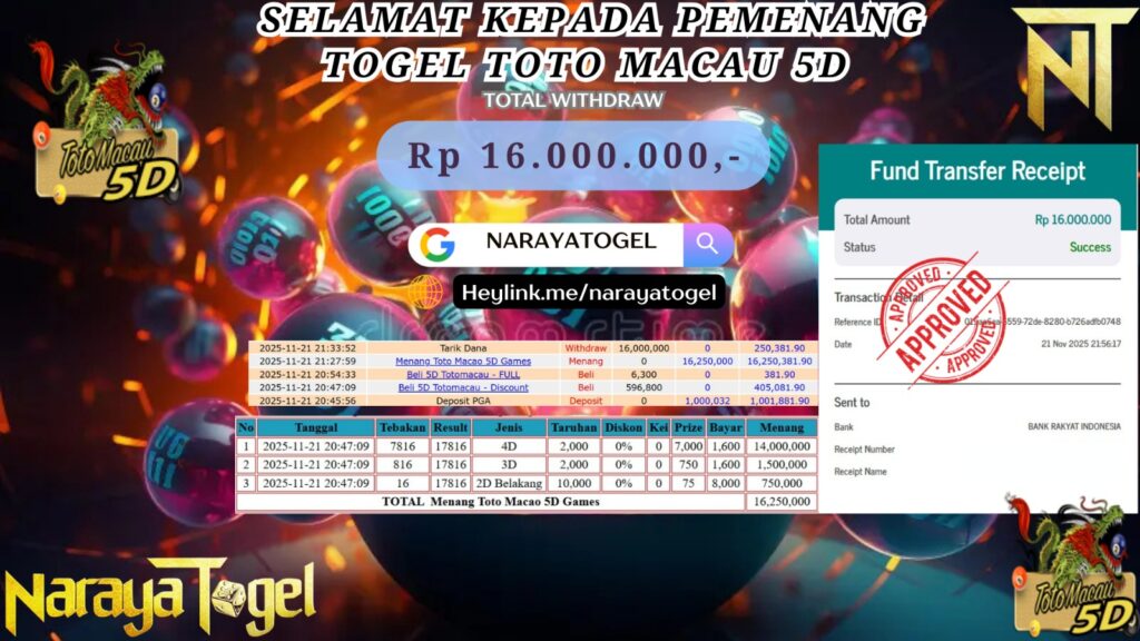 selamat kepada User id CEC* Telah berhasil mendapatkan kemenangan besar pada permainan TOTOMACAU 5D Dengan kemenangan Sebesar Rp 16.000.000 Setelah mengisi formulir withdraw dengan kurang waktu hanya 1 – 10 menit pihak NARAYATOGEL sudah melakukan transfer kepada pemiliknya dan dana sudah masuk ke rekening id tersebut oleh pemenang. Bukti pembayaran yang kami berikan merupakan bukti pembayaran yang SAH / VALID yang langsung di dapatkan melalui tanda transfer transaksi berhasil dari Bank yang di tuju.