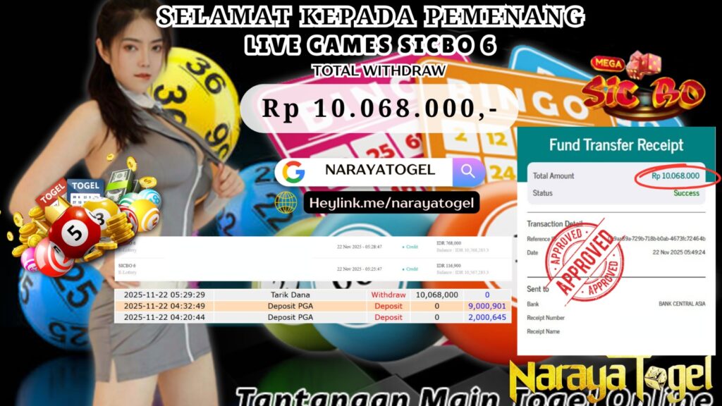 Selamat kepada User id her**** Telah berhasil mendapatkan kemenangan besar pada permainan LIVE GAME SICBO [DICE]   Dengan kemenangan Sebesar  Rp 10.068.000 Setelah mengisi formulir withdraw dengan kurang waktu hanya 1 – 10 menit pihak NARAYATOGEL sudah melakukan transfer kepada pemiliknya dan dana sudah masuk ke rekening id tersebut oleh pemenang. Bukti pembayaran yang kami berikan merupakan bukti pembayaran yang SAH / VALID yang langsung di dapatkan melalui tanda transfer transaksi berhasil dari Bank yang di tuju.
