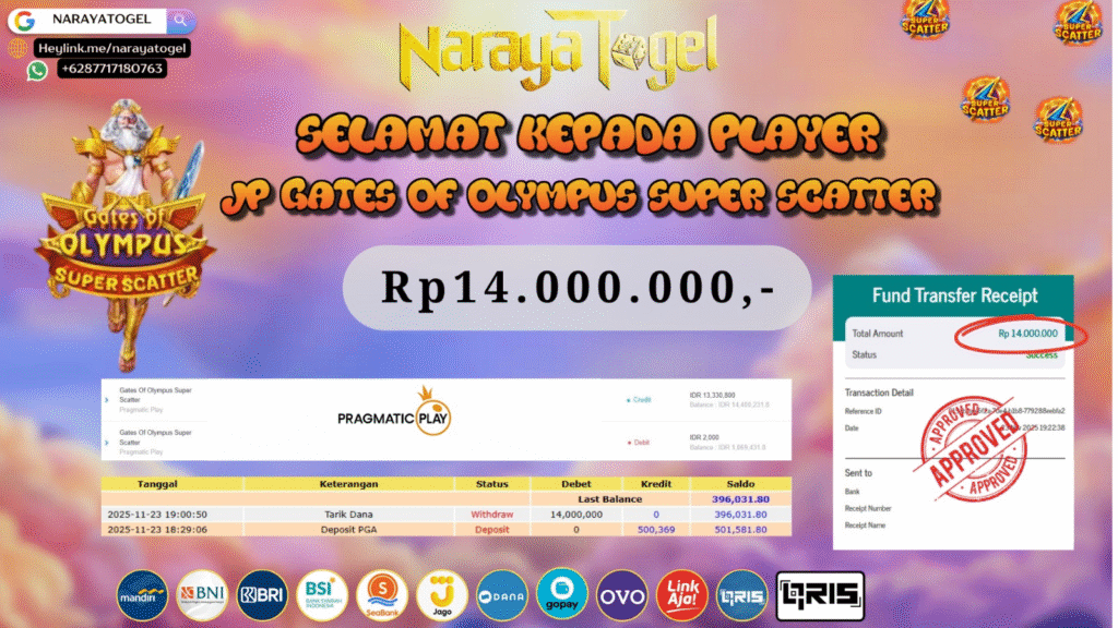 Selamat kepada User id her**** Telah berhasil mendapatkan kemenangan besar pada permainan GATES OF OLYMPUS SUPER SCATER Dengan kemenangan Sebesar Rp 14.000.000 Setelah mengisi formulir withdraw dengan kurang waktu hanya 1 – 10 menit pihak NARAYATOGEL sudah melakukan transfer kepada pemiliknya dan dana sudah masuk ke rekening id tersebut oleh pemenang. Bukti pembayaran yang kami berikan merupakan bukti pembayaran yang SAH / VALID yang langsung di dapatkan melalui tanda transfer transaksi berhasil dari Bank yang di tuju.