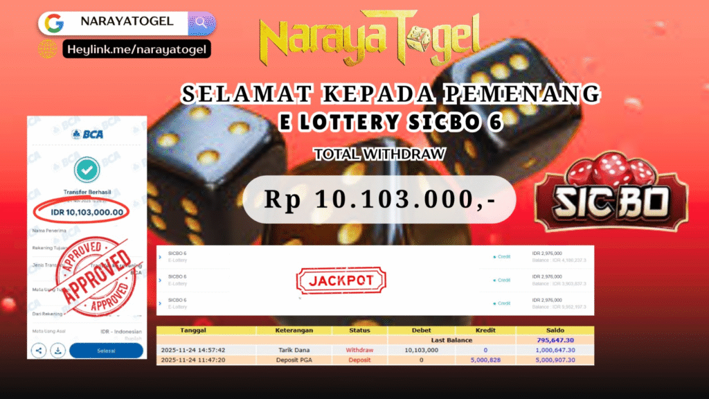 Selamat kepada User id JOJO**** Telah berhasil mendapatkan kemenangan besar pada permainan E LOTTERY SICBO 6   Dengan kemenangan Sebesar  Rp 10.103.000 Setelah mengisi formulir withdraw dengan kurang waktu hanya 1 – 10 menit pihak NARAYATOGEL sudah melakukan transfer kepada pemiliknya dan dana sudah masuk ke rekening id tersebut oleh pemenang. Bukti pembayaran yang kami berikan merupakan bukti pembayaran yang SAH / VALID yang langsung di dapatkan melalui tanda transfer transaksi berhasil dari Bank yang di tuju.