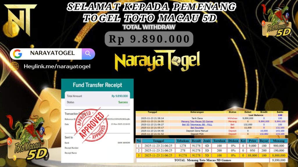 Selamat kepada User id ILH**** Telah berhasil mendapatkan kemenangan besar pada permainan TOTOMACAU 5D Dengan kemenangan Sebesar Rp 9.890.000 Setelah mengisi formulir withdraw dengan kurang waktu hanya 1 – 10 menit pihak NARAYATOGEL sudah melakukan transfer kepada pemiliknya dan dana sudah masuk ke rekening id tersebut oleh pemenang. Bukti pembayaran yang kami berikan merupakan bukti pembayaran yang SAH / VALID yang langsung di dapatkan melalui tanda transfer transaksi berhasil dari Bank yang di tuju.